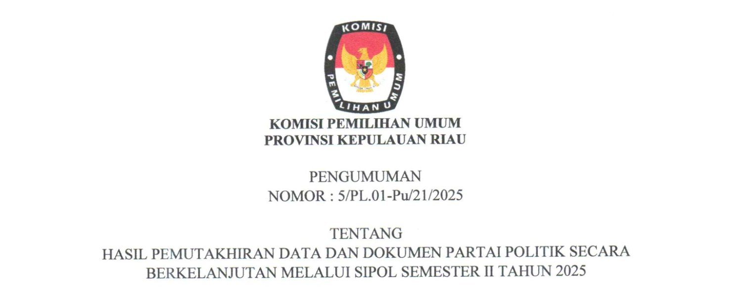 Berdasarkan Peraturan Komisi Pemilihan Umum Nomor 4 Tahun 2022 tentang Pendaftaran, Verifikasi, dan Penetapan Partai Politik Peserta Pemilihan Umum Anggota Dewan Perwakilan Rakyat dan Dewan Perwakilan Rakyat Daerah sebagaimana telah diubah dengan Peraturan Komisi Pemilihan Umum Nomor 11 Tahun 2022 tentang Perubahan Atas Peraturan Komisi Pemilihan Umum Nomor 4 Tahun 2022 tentang Pendaftaran, Verifikasi, dan Penetapan Partai Politik Peserta Pemilihan Umum Anggota Dewan Perwakilan Rakyat dan Dewan Perwakilan Rakyat Daerah dan Keputusan Komisi Pemilihan Umum Nomor 1365 Tahun 2023 tentang Pedoman Teknis Pemutakhiran Data Partai Politik secara Berkelanjutan melalui Sistem Informasi Partai Politik sebagaimana telah diubah dengan Keputusan Komisi Pemilihan Umum Nomor 658 Tahun 2024 tentang Perubahan atas Keputusan Komisi Pemilihan Umum Nomor 1365 Tahun 2023 tentang Pedoman Teknis Pemutakhiran Data Partai Politik secara Berkelanjutan melalui Sistem Informasi Partai Politik, Komisi Pemilihan Umum (KPU) Provinsi Kepulauan Riau melaksanakan kegiatan Pemutakhiran Data Partai Politik secara Berkelanjutan Semester II Tahun 2025 melalui Sistem Informasi Partai Politik (Sipol).