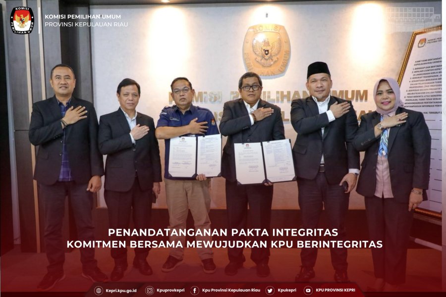 Komisi Pemilihan Umum (KPU) Provinsi Kepulauan Riau melaksanakan penandatanganan Pakta Integritas yang diikuti oleh Ketua KPU Provinsi Kepulauan Riau, Indrawan Susilo Prabowoadi, Anggota KPU Provinsi Kepulauan Riau, Muhammad Sjahri Papene, Priyo Handoko, Ferry M Manalu dan Jernih Millyati Siregar, didampingi Sekretaris KPU Provinsi Kepulauan Riau, Anwar, serta seluruh jajaran sekretariat KPU Provinsi Kepulauan Riau. Kegiatan ini berlangsung di Rumah Pintar Pemilu KPU Provinsi Kepulauan Riau, Selasa (20/01/2026).