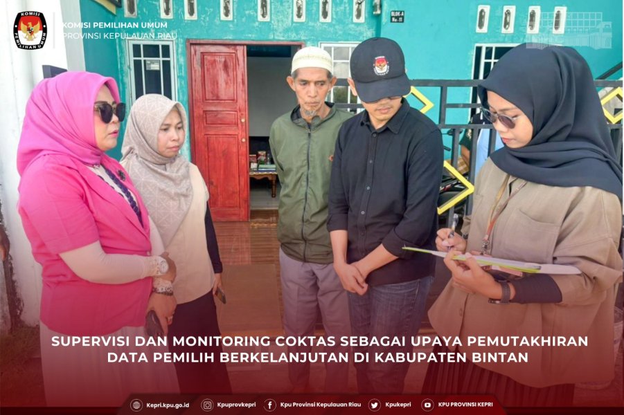 Komisi Pemilihan Umum (KPU) Provinsi Kepulauan Riau melaksanakan kegiatan supervisi dan monitoring pelaksanaan Pencocokan dan Penelitian Terbatas (Coktas) yang dilakukan oleh KPU Kabupaten Bintan. Kegiatan tersebut berlangsung di Kelurahan Sungai Lekop, Kecamatan Bintan Timur, Kabupaten Bintan pada Jumat (12/03/2026).