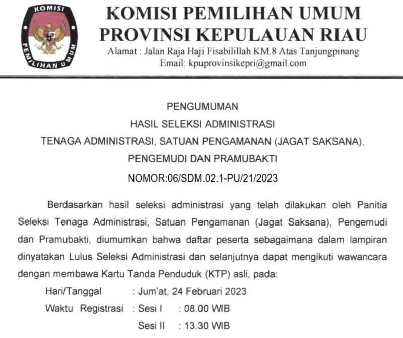 HASIL SELEKSI ADMINISTRASI TENAGA ADMINISTRASI, SATUAN PENGAMANAN (JAGAT SAKSANA), PENGEMUDI DAN PRAMUBAKTI