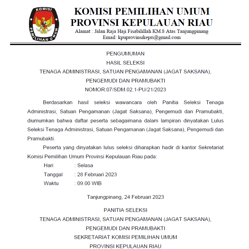 HASIL SELEKSI TENAGA ADMINISTRASI, SATUAN PENGAMANAN (JAGAT SAKSANA), PENGEMUDI DAN PRAMUBAKTI DISINI