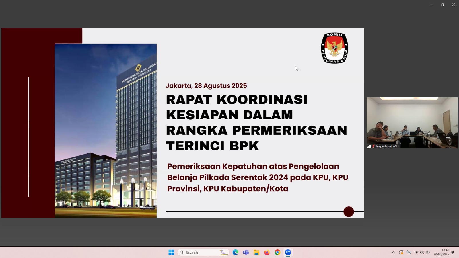Komisi Pemilihan Umum (KPU) Provinsi Kepulauan Riau mengikuti Rapat Persiapan Pemeriksaan Dengan Tujuan Tertentu (PDTT) Terperinci oleh Badan Pemeriksa Keuangan (BPK) terkait Pengelolaan Belanja Pilkada Serentak Tahun 2024, yang diselenggarakan secara daring oleh Inspektorat Wilayah I Sekretariat Jenderal KPU RI, Selasa (28/08/2025).