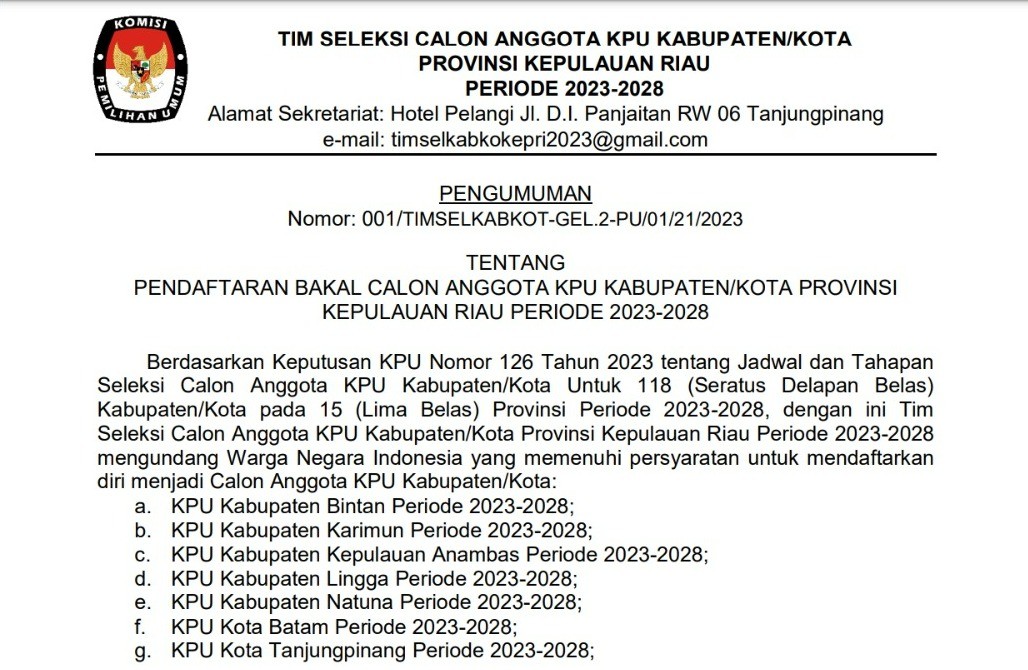 Berdasarkan Keputusan KPU Nomor 126 Tahun 2023 tentang Jadwal dan Tahapan Seleksi Calon Anggota KPU Kabupaten/Kota Untuk 118 (Seratus Delapan Belas) Kabupaten/Kota pada 15 (Lima Belas) Provinsi Periode 2023-2028, dengan ini Tim Seleksi Calon Anggota KPU Kabupaten/Kota Provinsi Kepulauan Riau Periode 2023-2028 mengundang Warga Negara Indonesia yang memenuhi persyaratan untuk mendaftarkan diri menjadi Calon Anggota KPU Kabupaten/Kota Periode 2023-2028, dengan ketentuan sebagai berikut: DOWNLOAD DISINI