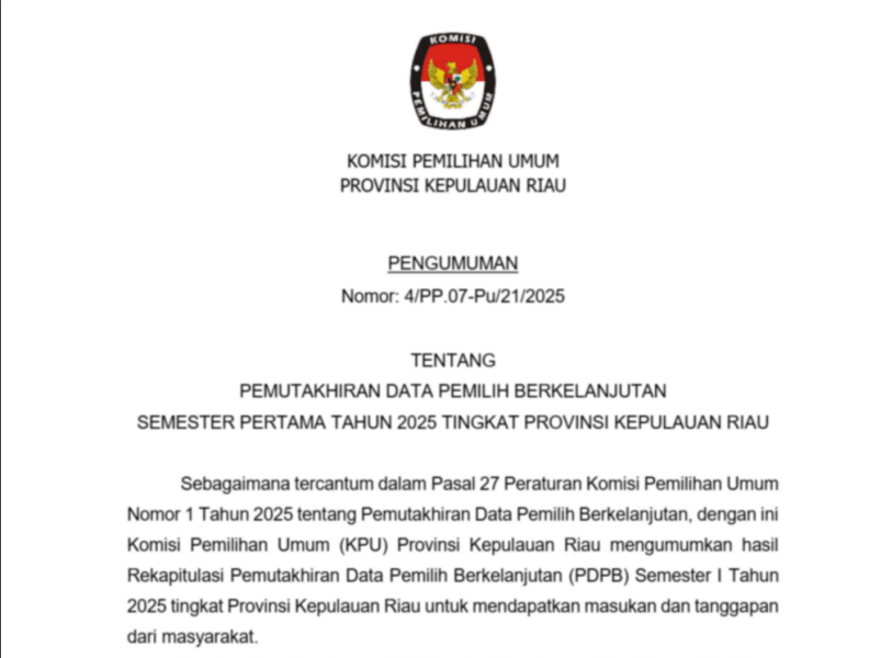 PENGUMUMAN PEMUTAKHIRAN DATA PEMILIH BERKELANJUTAN SEMESTER PERTAMA TAHUN 2025 TINGKAT PROVINSI KEPULAUAN RIAU