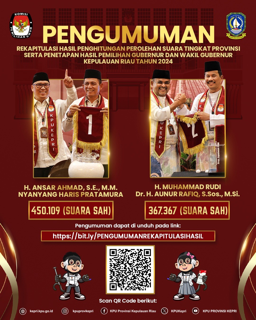 Pengumuman Rekapitulasi Hasil Penghitungan Perolehan Suara Tingkat Provinsi Serta Penetapan Hasil Pemilihan Gubernur dan Wakil Gubernur Kepulauan Riau Tahun 2024