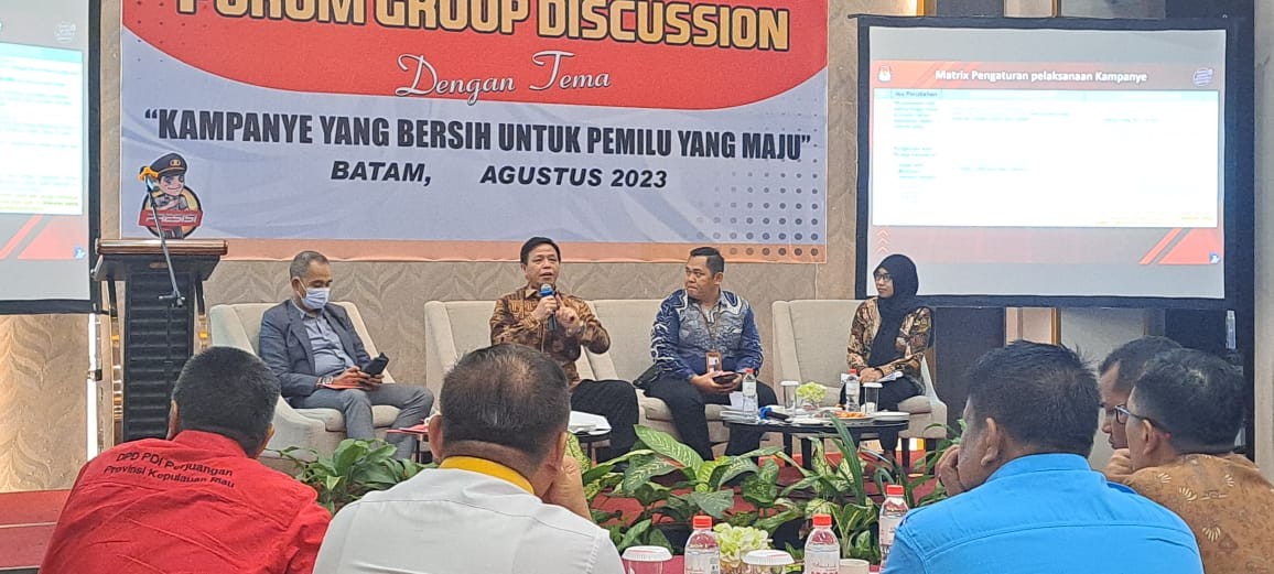 Komisioner KPU Provinsi Kepulauan Riau Ferry M. Manalu menjadi Narasumber pada kegiatan Forum Group Discussion yang dilaksanakan oleh Polda Kepri dengan Tema "Kampanye Yang Bersih Untuk Pemilu Yang Maju" Dengan Peserta ± 50 Orang. Pada hari Selasa tanggal 22 Agustus 2023 pukul 08.00 WIB bertempat di Hotel AsiaLink Pelita Kota Batam. turut hadir Narasumber Kombespol M. Rodjak Sulaeli (Dir Intelkam Polda Kepri) dan Zulhadril Putra, S.T (Komisioner Bawaslu Provinsi Kepri)
