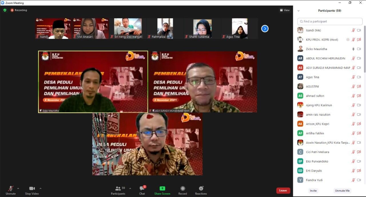 Dalam sambutannya Ketua KPU Provinsi Kepulauan Riau, Sriwati menyampaikan bahwa pelaksanaan program Desa Peduli Pemilu dan Pemilihan (DP3) adalah program dari KPU RI untuk meningkatkan partisipasi pemilih dan memberikan Pendidikan politik kepada masyarakat. Kegiatan ini telah menetapkan 2 lokus yang dipilih, yaitu di Kelurahan Tanjung Pinang Timur, Kec. Bukit Bestari, Kota Tanjungpinang dan Kelurahan Sungai Lakam Timur, Kec. Karimun, Kabupaten Karimun. Ia mengharapkan ke depannya tidak hanya di dua kabupaten itu saja, tetapi juga di kabupaten/kota yang lain.