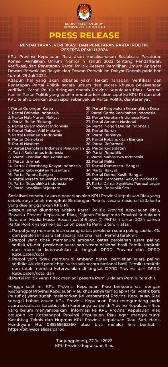 PRESS RELEASE Kamis, 28 Juli 2022 08:00 142 Bagi partai politik di Provinsi Kepulauan Riau yang belum menyampaikan informasi diharapkan dapat menyampaikan melalui link https://bit.ly/sosialisasiparpol Baca Selengkapnya