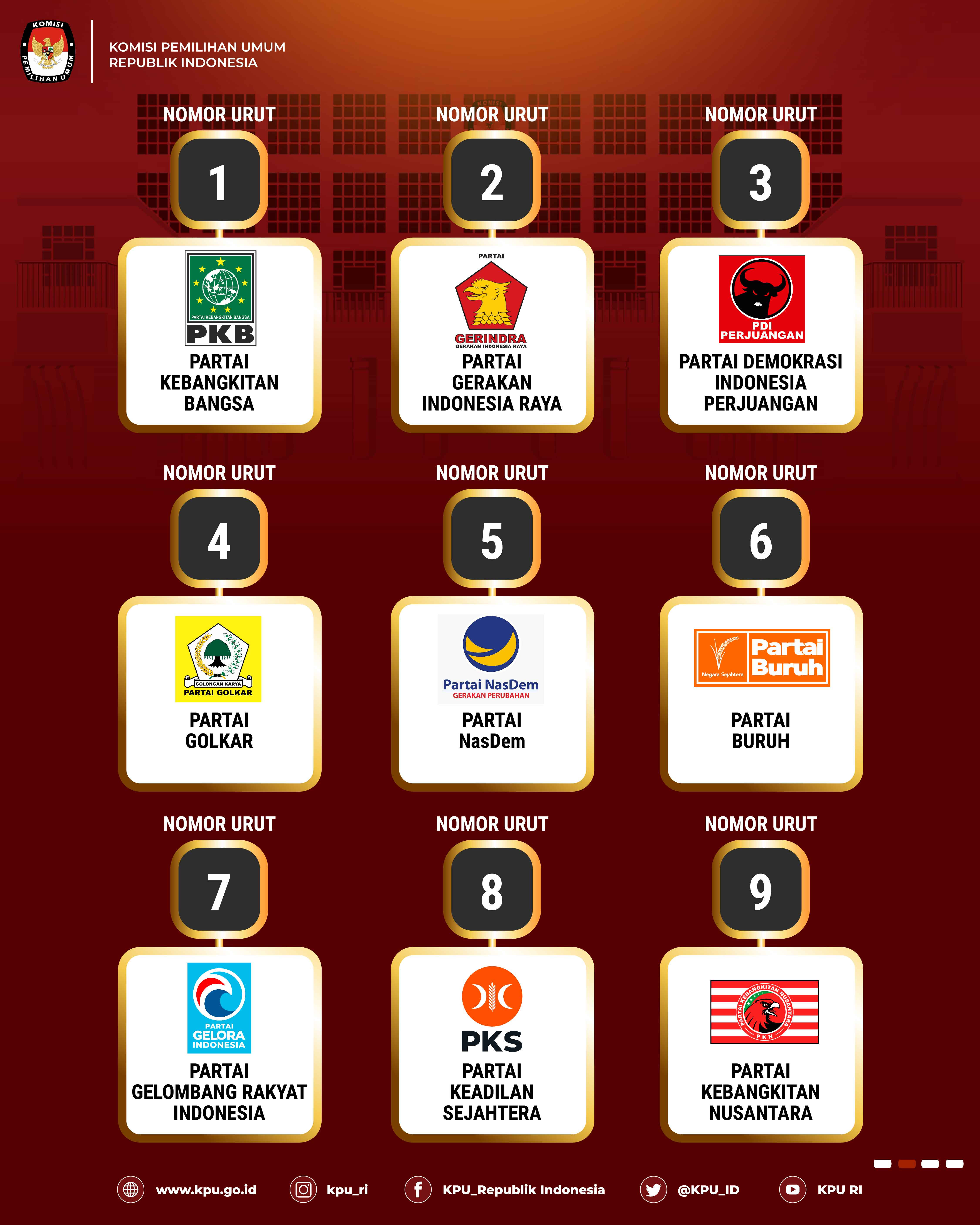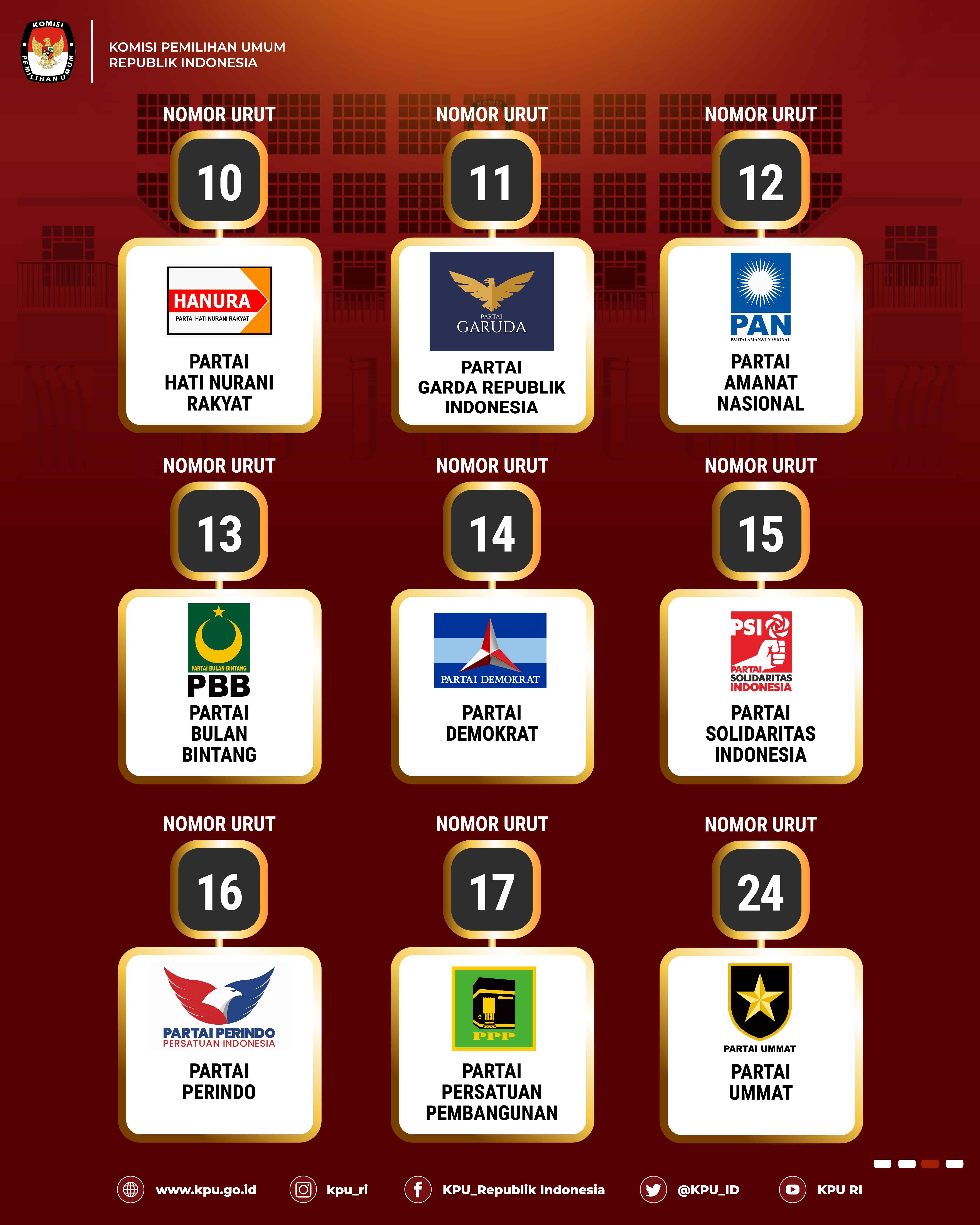 Sesuai Keputusan KPU Nomor 552 Tahun 2022 tentang Perubahan atas Keputusan KPU Nomor 519 Tahun 2019 tentang Penetapan Nomor Urut Partai Politik Peserta Pemilihan Umum Anggota Dewan Perwakilan Rakyat dan Dewan Perwakilan Rakyat Daerah dan Partai Politik Lokal Aceh Peserta Pemilihan Umum Anggota Dewan Perwakilan Rakyat Aceh dan Dewan Perwakilan Rakyat Kabupaten/Kota Tahun 2024